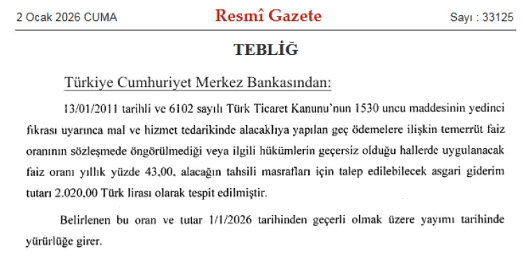 ANKARA (İGFA) - Türkiye Cumhuriyet Merkez Bankası'ndan yayımlanan tebliğ ile mal ve hizmet tedarikinde geç ödemelerde uygulanacak temerrüt faiz oranı 2026 yılı için yıllık yüzde 43 olarak güncellendi. Geçen yıl yüzde 53,25 olan oran yaklaşık 10 puan düşürüldü.