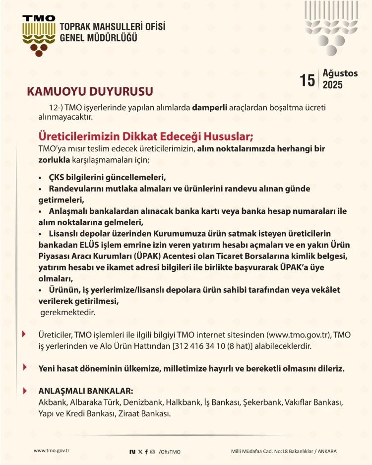 Toprak Mahsulleri Ofisi (TMO), 18 Ağustos 2025 Pazartesi gününden itibaren mısır alımlarına başlayacağını duyurdu. Ton başına 11 bin 300 TL olarak belirlenen alımlar, randevu sistemiyle gerçekleştirilecek ve sistem 16 Ağustos 2025’te erişime açılacak.