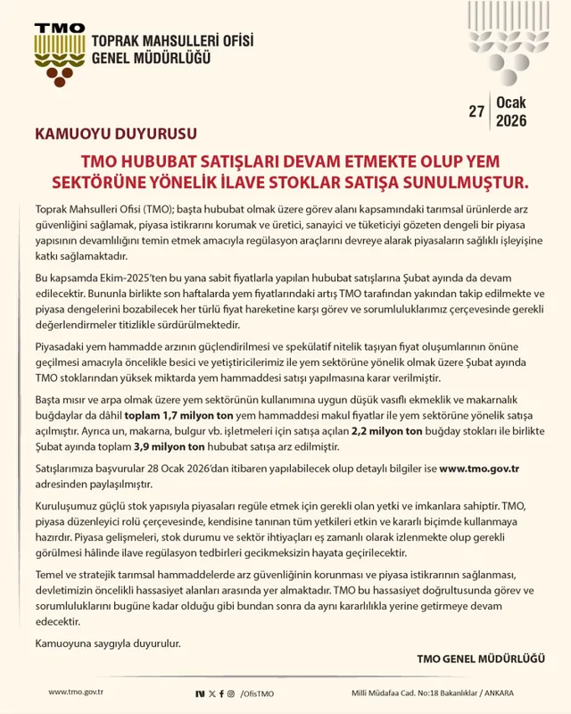 Satışlara ilişkin başvuruların 28 Ocak 2026 tarihinden itibaren alınacağı belirtilirken, detaylı bilgilere www.tmo.gov.tr adresinden ulaşılabileceği kaydedildi.