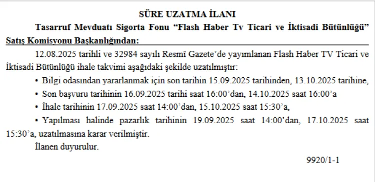 Tasarruf Mevduatı Sigorta Fonu (TMSF), “Flash Haber TV Ticari ve İktisadi Bütünlüğü” ihalesine ilişkin takvimin uzatıldığını duyurdu. Bugünkü Resmi Gazete’de yayımlanan ilana göre, ihale süreci yeni tarihlerle güncellendi.