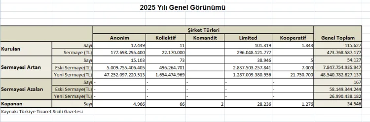Aralık 2025 özelinde ise kurulan şirket sayısı, Aralık 2024’e göre yüzde 1,1, kurulan gerçek kişi ticari işletme sayısı yüzde 4,5 artış gösterdi. Aralık ayında kurulan kooperatif sayısı ise yüzde 11,7 azaldı. Bir önceki aya göre ise kurulan şirket sayısında yüzde 34,7, kurulan gerçek kişi ticari işletme sayısında yüzde 44,4, kurulan kooperatif sayısında yüzde 18,6 oranında artış yaşandı. Kapanan işyerlerinde ise şirketler yüzde 193,6, kooperatifler yüzde 284,9 ve gerçek kişi ticari işletmeler yüzde 103,4 oranında artış gösterdi.