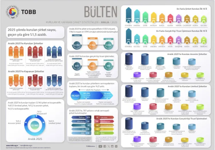 ANKARA (İGFA) - Türkiye Odalar ve Borsalar Birliği’nin (TOBB) açıkladığı 2025 yılı işyeri istatistiklerine göre, geçen yıla kıyasla kurulan şirket sayısı yüzde 1,5 azalırken, kurulan kooperatif sayısı yüzde 30,9 oranında düşüş gösterdi. Buna karşın, kurulan gerçek kişi ticari işletme sayısı yüzde 10,8 artış kaydetti.