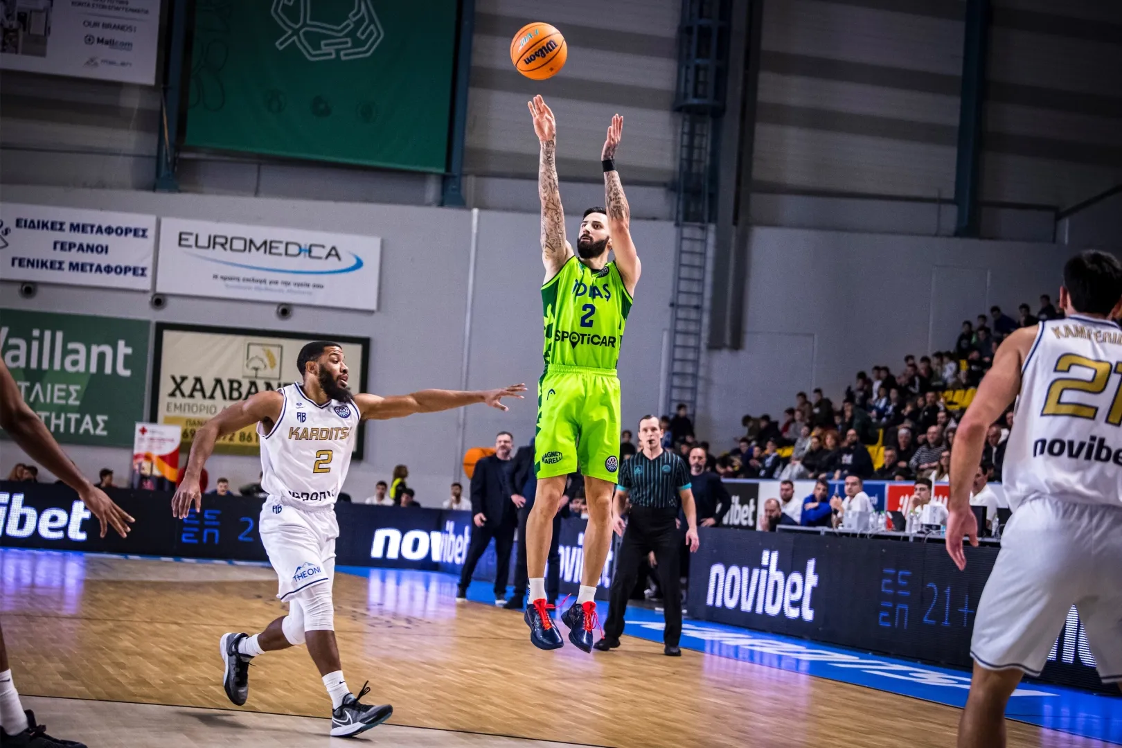 Giannis Bourousis Karditsa’da oynanan maça Alex Perez, Furkan Korkmaz, Maxwell Lewis, Yiğitcan Saybir, Marek Blazevic beşiyle başlayan Mavi Yeşilliler, ilk basketini Yiğitcan Saybir ile buldu. Rakibin 9-0’lık serisine Furkan Korkmaz ile son veren Bursa ekibi, Maxwell Lewis ve Yiğitcan Saybir’in sayılarıyla 5. dakikada 9-10 öne geçti. Rakip sayılarına Marek Blazevic, Isaiah Whaley ile karşılık vermeye çalışan konuk takım, ilk periyodu 22-14 geride kapattı.