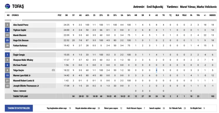 Bursaspor Basketbol karşısında TOFAŞ’ta Hugo Besson 20 sayı ile en skorer isim olurken; Alex Perez, Marek Blazevic, Furkan Korkmaz ve Tolga Geçim’den 9’ar sayılık katkı geldi.