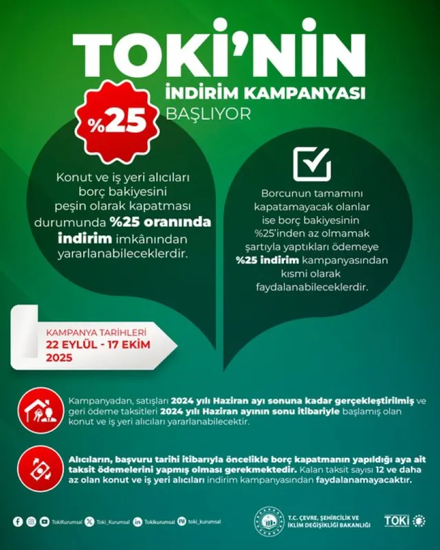 Çevre, Şehircilik ve İklim Değişikliği Bakanlığı Toplu Konut İdaresi Başkanlığı (TOKİ), vatandaşlardan gelen yoğun talep üzerine geri ödemeleri devam eden konut ve iş yerleri için 'Yüzde 25 İndirim Kampanyası' düzenledi. Borcunu peşin ödeyip tapusunu hemen almak isteyen konut ve iş yeri alıcıları için yüzde 25 oranında indirim yapılacak. Başvurular 22 Eylül'de başlıyor.