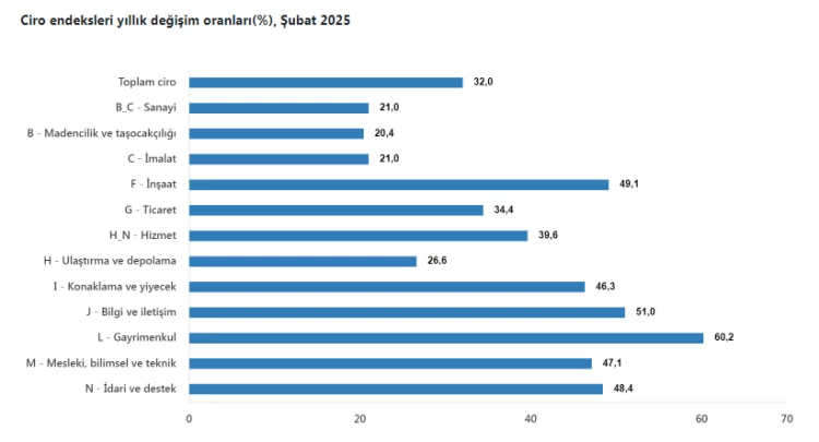 Yüzde 32 artış kaydedilen yıllık cironun toplam cironun alt detaylarına bakıldığında; 2025 yılı Şubat ayında yıllık sanayi sektörü ciro endeksi yüzde 21,0 arttı, inşaat ciro endeksi yüzde 49,1 arttı, ticaret ciro endeksi yüzde 34,4 arttı, hizmet ciro endeksi yüzde 39,6 arttı.