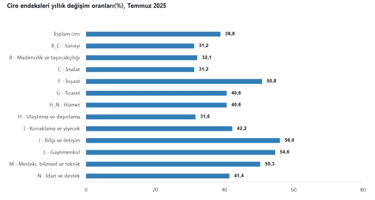 2025 Temmuz'da sanayi, inşaat, ticaret ve hizmet sektörlerini kapsayan toplam ciro endeksi yıllık yüzde 38,8, aylık ise yüzde 2,1 azaldı. Sanayide yıllık yüzde 31,2 artış, inşaatta yüzde 50,8 artış, ticaret ve hizmette yüzde 40,6 artış yaşanırken, aylık sadece inşaat ciro endeksi arttı.