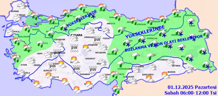 ANKARA (İGFA) - Meteoroloji Genel Müdürlüğü, 01 Aralık Pazartesi gününe ilişkin hava tahmin raporunu yayımladı. Yapılan son tahminlere göre, yurt genelinin parçalı ve çok bulutlu, Marmara'nın doğusu, Kuzey Ege, İç Anadolu (Karaman ve Niğde hariç), Karadeniz, Doğu Anadolu, Kahramanmaraş, Osmaniye, Hatay ve Siirt çevreleri ile Adana'nın doğu, Aydın'ın kıyı kesimlerinin yağışlı geçeceği tahmin ediliyor.
