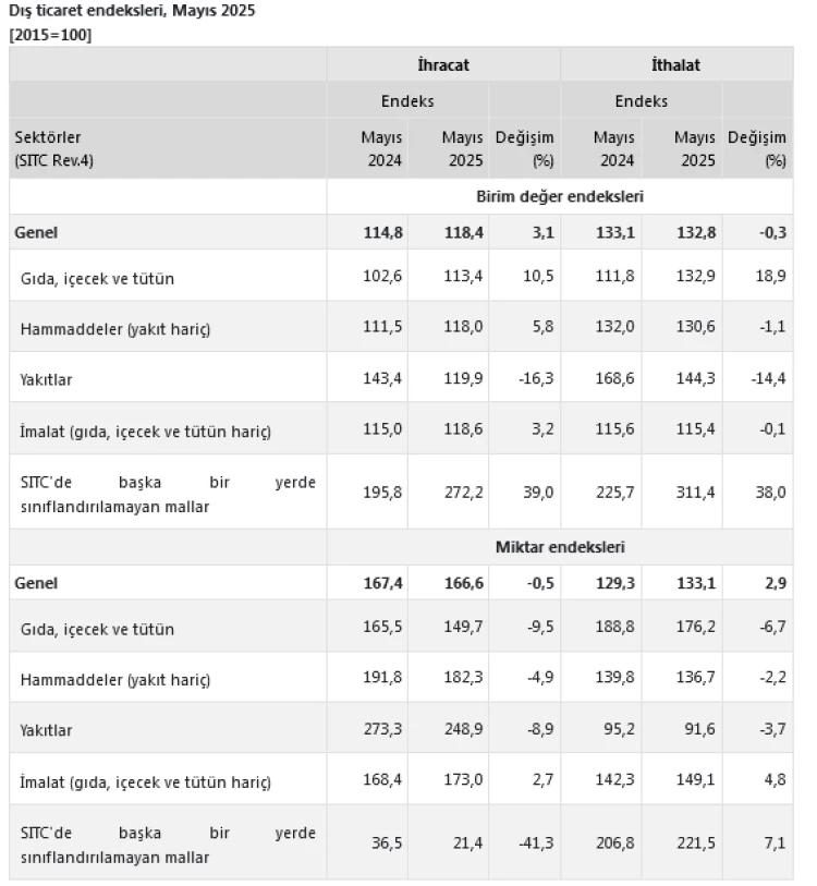 TÜİK verilerine göre, Mayıs 2025’te ihracat birim değer endeksi yüzde 3,1 artarken, ithalat birim değer endeksi yüzde 0,3 azaldı; dış ticaret haddi 2,9 puan iyileşerek 89,1 oldu