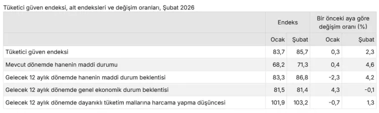 TÜİK ve Merkez Bankası işbirliğiyle yürütülen anket sonuçlarına göre, tüketici güven endeksi Şubat ayında 85,7’ye yükseldi.
