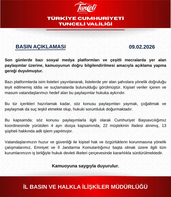 Tunceli Valisi Şefik Aygöl, sosyal medyada yayılan doğruluğu teyit edilmemiş iddialara karşı vatandaşları bilgilendirdi ve hukuki sürece dikkat çekti.
