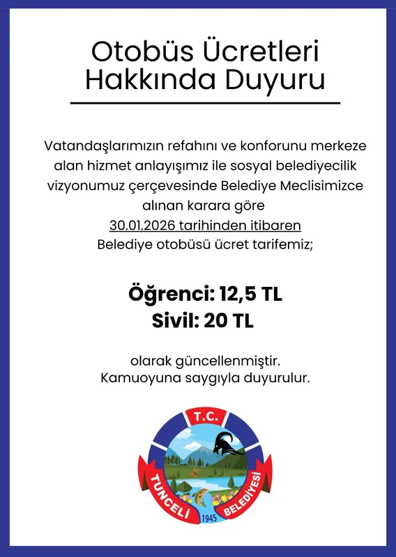 Tunceli Belediyesi, toplu taşıma hizmetlerinde yeni ücret tarifesini duyurdu. Belediye Meclisi kararıyla güncellenen tarifeler, 30 Ocak 2026 tarihinden itibaren geçerli olacak.