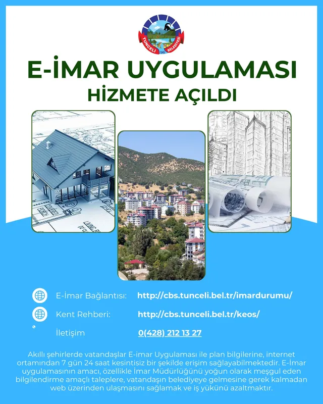 Tunceli Belediyesi, akıllı şehir uygulamaları kapsamında E-İmar sistemini devreye aldı. Vatandaşlar, bu uygulama ile parsel bazlı imar planı bilgilerine internet üzerinden, haftanın yedi günü ve 24 saat kesintisiz olarak erişim sağlayabiliyor.