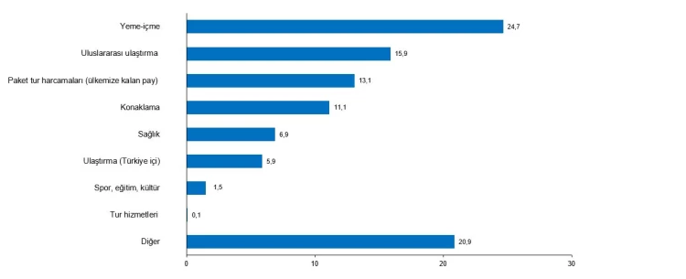 Geceleme yapan ziyaretçilerin gecelik ortalama harcaması 99 dolar, yurt dışı ikametli vatandaşların ise 67 dolar oldu. Harcamalarda yeme-içme yüzde 24,7, uluslararası ulaştırma yüzde 15,9, paket turlar yüzde 13,1 pay aldı. Paket tur harcamaları yüzde 20,8, yeme-içme yüzde 15,7, Türkiye içi ulaştırma yüzde 8,9 arttı.