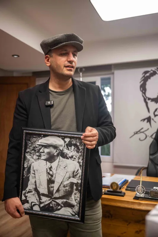 Ziyarette ayrıca Başkan Eşki’ye, Atatürk’ün döneminin giyim tarzını yansıtan ekose ceket, kravat ve kasketli siyah-beyaz bir fotoğrafı da hediye edildi.