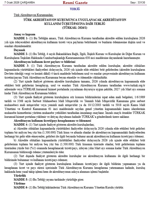 ANKARA (İGFA) - Türk Akreditasyon Kurumu tarafından hazırlanan “Türk Akreditasyon Kurumunca Uygulanacak Akreditasyon Kullanım Ücreti/Payına Dair Tebliğ, bugünkü Resmi Gazete’de yayımlanarak yürürlüğe girdi. Tebliğ ile, TÜRKAK tarafından akredite edilen kuruluşların 2026 yılı boyunca akreditasyon kapsamındaki faaliyetlerinden elde ettikleri gelirler üzerinden ödeyecekleri kullanım ücreti ve paylarına ilişkin esaslar düzenlendi.