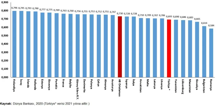 AB-27’de en yüksek Finlandiya (0,796), İsveç (0,795), İrlanda (0,793); en düşük Romanya (0,584), Bulgaristan (0,614), Slovakya (0,665).