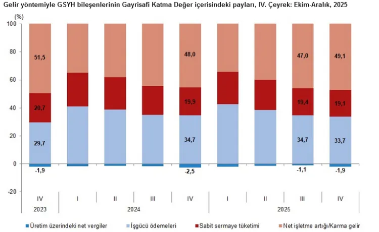 Bu arada 2025'in son çeyrek raporuna göre işgücü ödemeleri de 2025 yılında yüzde 40,4 artarken, net işletme artığı/karma gelir yüzde 44,2 yükseldi. İşgücü ödemelerinin Gayrisafi Katma Değer içindeki payı yüzde 36,9 olurken, net işletme artığı/karma gelirin payı yüzde 44,1’e çıktı.
