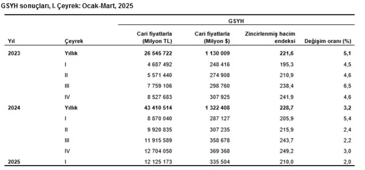 TÜİK verilerine göre, 2025 yılı birinci çeyreğinde GSYH yüzde 2 arttı. İnşaat sektörü yüzde 7,3 büyürken, tarım ve sanayi daraldı. Cari fiyatlarla GSYH 12 trilyon 125 milyar TL’ye ulaştı.