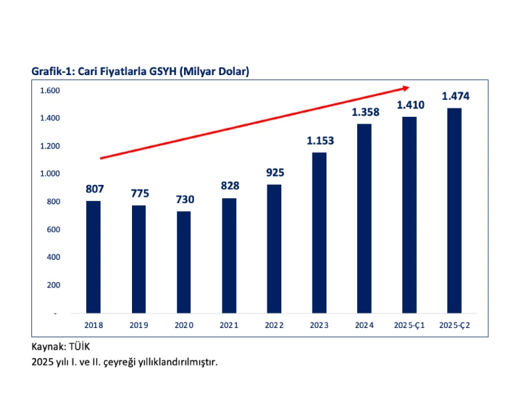 Türkiye ekonomisi, 2020’de yüzde 1,8, 2021’de yüzde 11,8, 2022’de yüzde 5,4, 2023’te yüzde 5, 2024’te yüzde 3,3 büyüdü. 2025’in ilk çeyreğinde yüzde 2,3 olan büyüme, ikinci çeyrekte yüzde 4,8’e yükseldi. Yılın ilk yarısında büyüme yüzde 3,6 oldu.