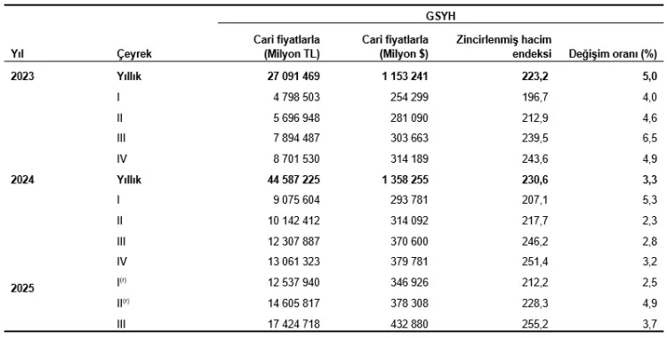 Üretim yöntemiyle GSYH, 2025 üçüncü çeyreğinde cari fiyatlarla yüzde 41,6 artarak 17 trilyon 424 milyar 718 milyon TL oldu. Bu değer dolar bazında 432 milyar 880 milyon olarak hesaplandı.