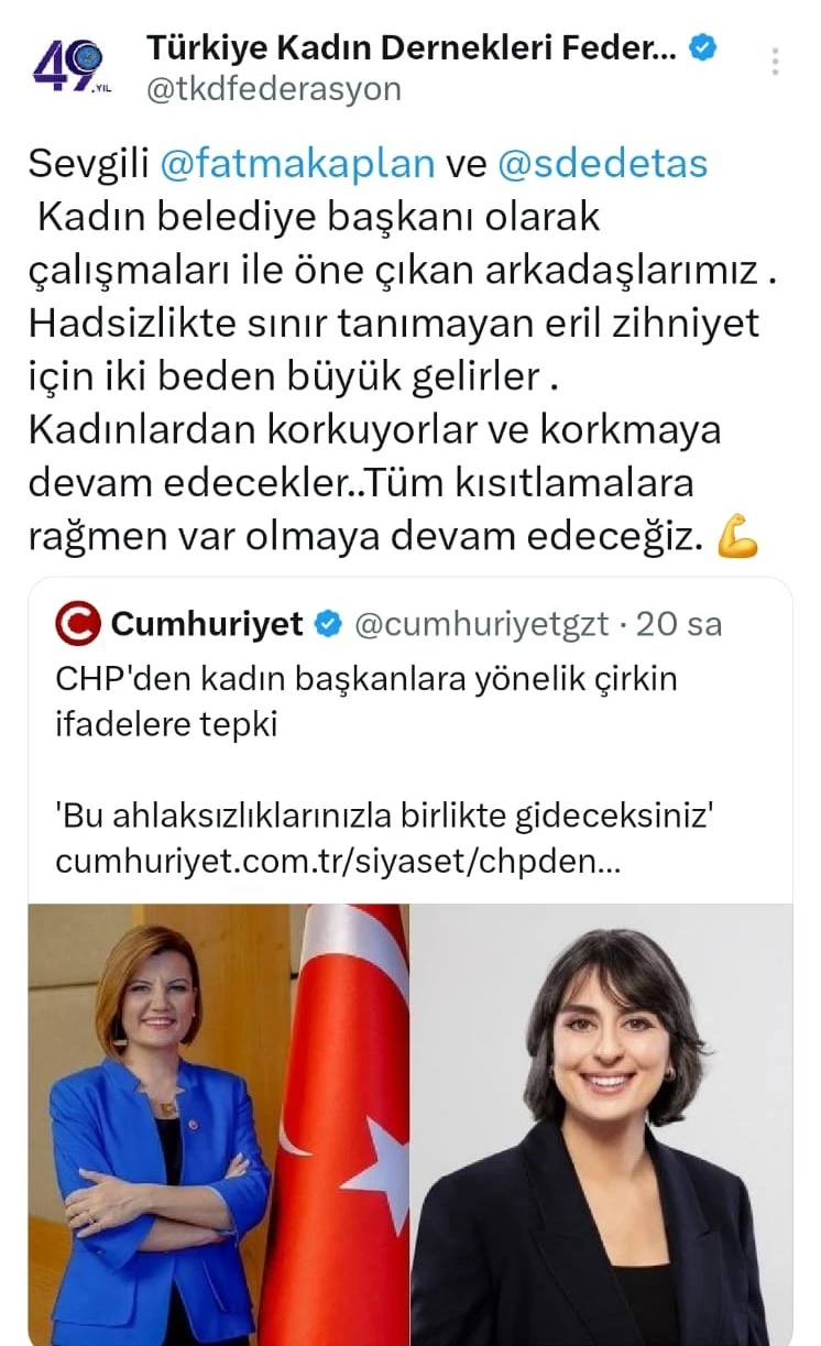 Türkiye Kadın Dernekleri Federasyonu yaptığı paylaşımda şu sözlere yer verdi, “ Sevgili Fatma Kaplan Hürriyet ve Sinem Dedetaş kadın belediye başkanı olarak yaptıkları çalışmalar ile öne çıkan arkadaşlarımız. Hadsizlikte sınır tanımayan eril zihniyet için iki beden büyük gelirler. Kadınlardan korkuyorlar ve korkmaya devam edecekler. Tüm kısıtlamalara rağmen var olmaya devam edeceğiz”