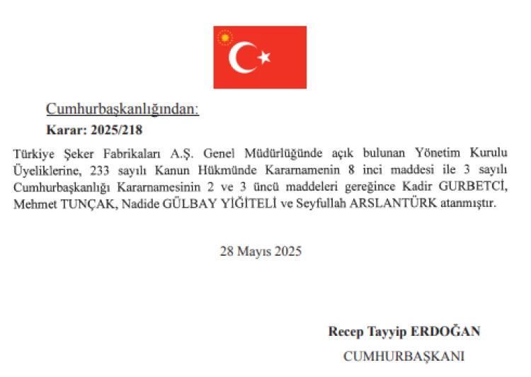 Resmi Gazete’de yayımlanan atama kararları kapsamında,Cumhurbaşkanı Recep Tayyip Erdoğan’ın imzasıyla duyurulan kararlara göre, Türkiye Şeker Fabrikaları A.Ş. Genel Müdürlüğü Yönetim Kurulu Üyeliklerine Kadir Gurbetci, Mehmet Tunçak, Nadide Gülbay Yiğiteli ve Seyfullah Arslantürk atandı.