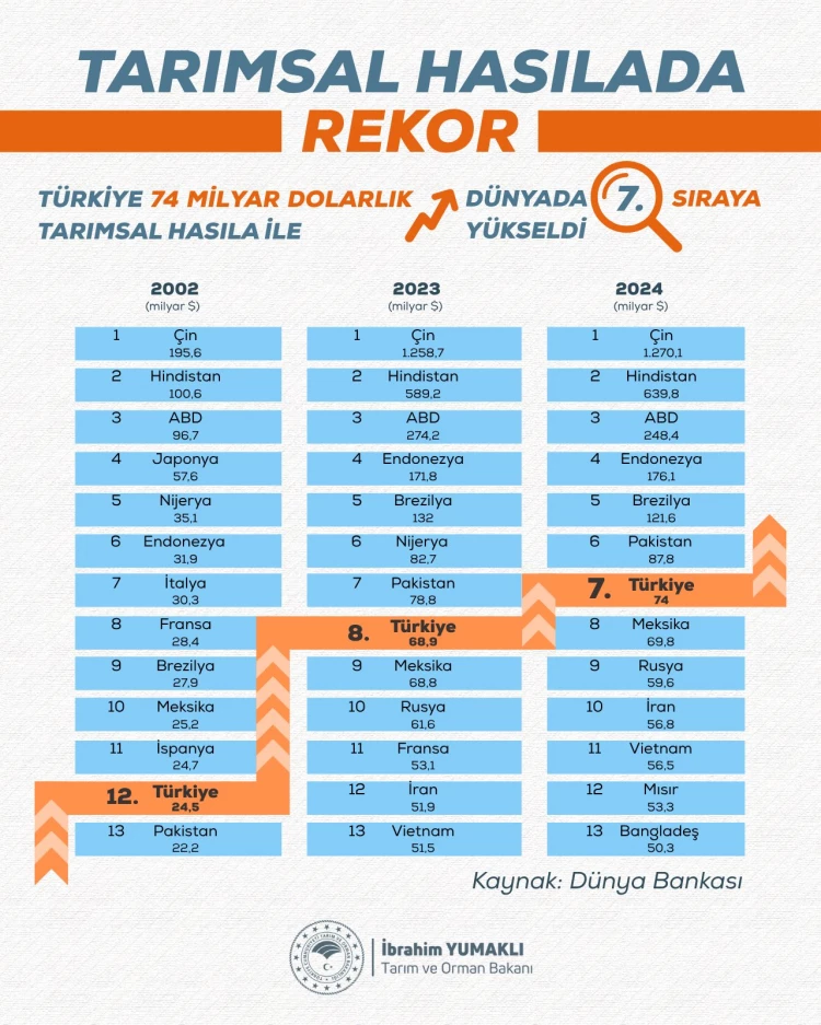 Tarım ve Orman Bakanı İbrahim Yumaklı, 2024 yılında tarımsal hasılanın yüzde 7 artarak 74 milyar dolara ulaştığını duyurdu. Türkiye, bu başarıyla dünyada ilk 7 ülke arasına girdi.