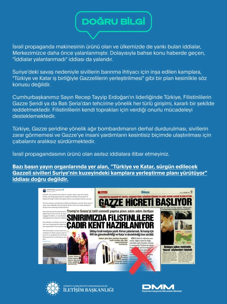 Bazı basın yayın organlarında yer alan, “Türkiye ve Katar’ın sürgün edilecek Gazzeli sivilleri Suriye’nin kuzeyindeki kamplara yerleştirme planı yaptığı” iddiası gerçeği yansıtmadığı bildirildi.