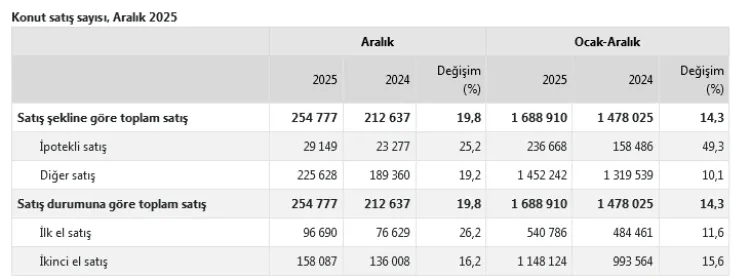 TÜİK verilerine göre Türkiye genelinde konut satışları 2025 yılında artışını sürdürdü. Aralık ayında ise satışlar yüzde 19,8 yükselerek 254 bin 777’ye ulaştı. Veriler, 2025 yılında konut piyasasında satışların genel olarak canlandığını, özellikle ipotekli ve ilk el satışlarda belirgin artış yaşandığı istatistiki tablolara yansıdı.