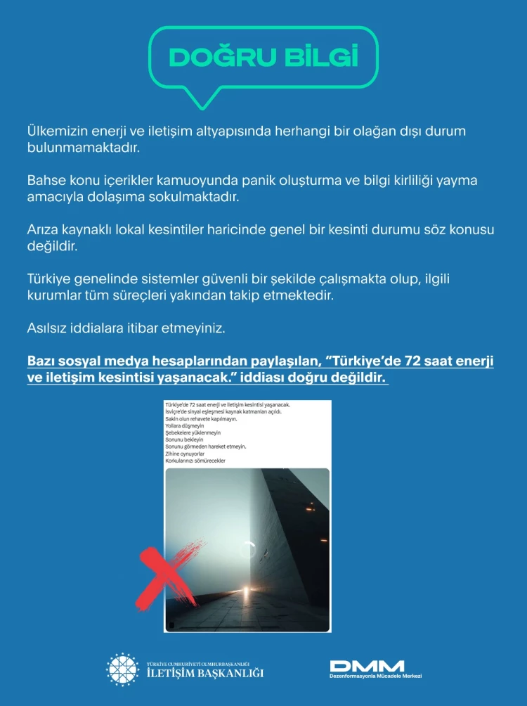 ANKARA (İGFA) - Türkiye’de 72 saat enerji ve iletişim kesintisi yaşanacağı iddiasına ilişkin açıklama İletişim Başkanlığı'ndan geldi.