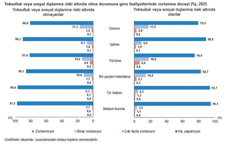 TÜİK verilerine göre, fertlerin çoğu iletişim, öz bakım, işitme ve yürüme gibi temel faaliyetlerde sorun yaşamıyor. İletişimde zorluk yaşayanların oranı yalnızca yüzde 2,2 olurken, görme (yüzde 17,3), yürüme (yüzde 15,2) ve hatırlama (yüzde 12,6) alanlarında daha yüksek zorluklar gözlemlendi.