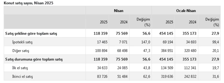 Ocak-Nisan 2025 döneminde konut satışları, geçen yıla göre yüzde 27,9 artarak 454 bin 145’e ulaştı.
