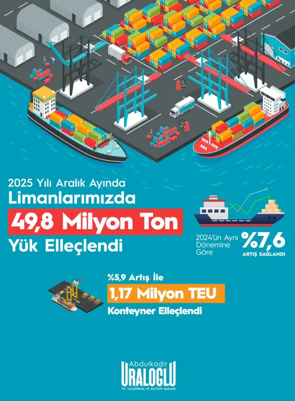 Ulaştırma ve Altyapı Bakanı Abdulkadir Uraloğlu, Aralık 2025’te Türkiye limanlarında elleçlenen yük miktarının geçen yılın aynı dönemine göre yüze 7,6 artarak 49,8 milyon tona yükseldiğini açıkladı.