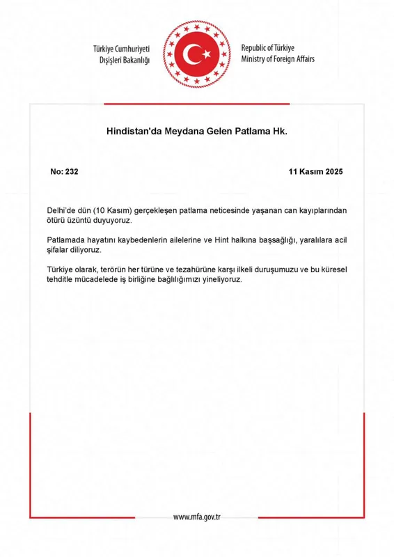 ANKARA (İGFA) - Dışişleri Bakanlığı, Hindistan’ın başkenti Delhi’de 10 Kasım’da gerçekleşen patlamayla ilgili resmi bir açıklama yaptı. Bakanlık, patlamada hayatını kaybedenlerin ailelerine ve Hint halkına başsağlığı, yaralılara ise acil şifalar diledi.
