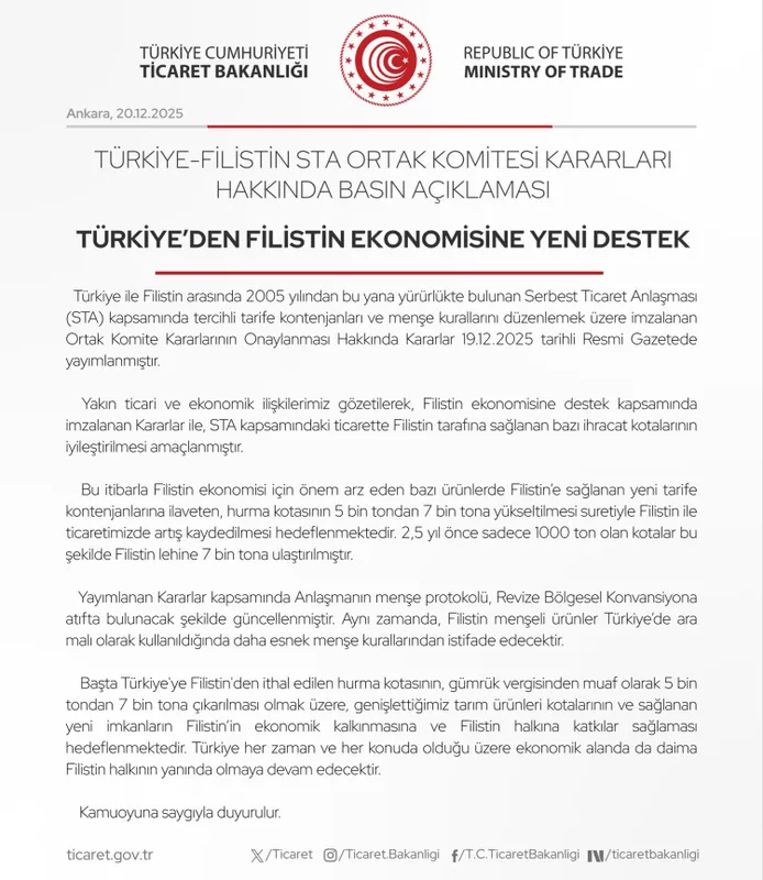 Bu kapsamda, Filistin ekonomisi açısından büyük önem taşıyan ürünlerde yeni tarife kontenjanları tanımlanırken, Türkiye’ye gümrük vergisinden muaf olarak ithal edilen Filistin menşeli hurmanın kotası 5 bin tondan 7 bin tona yükseltildi. Açıklamada, 2,5 yıl önce yalnızca 1.000 ton olan hurma kotasının bu düzenlemeyle Filistin lehine önemli ölçüde artırıldığı vurgulandı.
