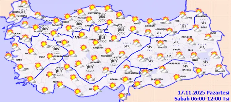 ANKARA (İGFA) - Meteoroloji'nin 17 Kasım Pazartesi gününe ilişkin hava tahmin raporuna göre, yurdun genelinde yağış beklenmiyor. Sabah ve gece saatlerinde Trakya, İç Ege, Akdeniz’in iç kesimleri, İç Anadolu'nun güney ve doğusu, Karadeniz'in iç kesimleri, Doğu Anadolu ile Güneydoğu Anadolu'nun kuzeyinde pus ve yer yer sis bekleniyor.