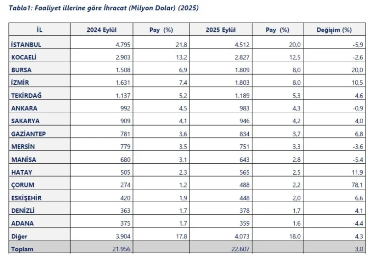 Açıklamada, 27 ilin 1 milyar doların üzerinde ihracat yaptığı belirtildi. Eylül ayı iller bazında en yüksek ihracat rakamları şöyle: