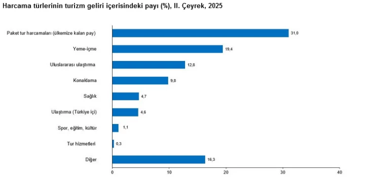 Paket tur harcamalarının toplam turizm gelirindeki payı yüzde 31, yeme-içme harcamaları yüzde 19,4, uluslararası ulaştırma harcamaları yüzde 12,8 olarak gerçekleşti. Bir önceki yıla göre uluslararası ulaştırma harcamaları yüzde 13,8, yeme-içme harcamaları yüzde 13,7, tur hizmetleri harcamaları yüzde 12,5 artış gösterdi.