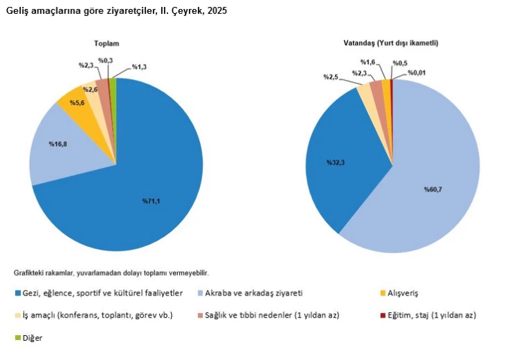 Ziyaretçilerin yüzde 71,1’i gezi, eğlence, sportif ve kültürel faaliyetler için Türkiye’yi tercih ederken, yüzde 16,8’i akraba ve arkadaş ziyareti, yüzde 5,6’sı alışveriş amacıyla geldi.