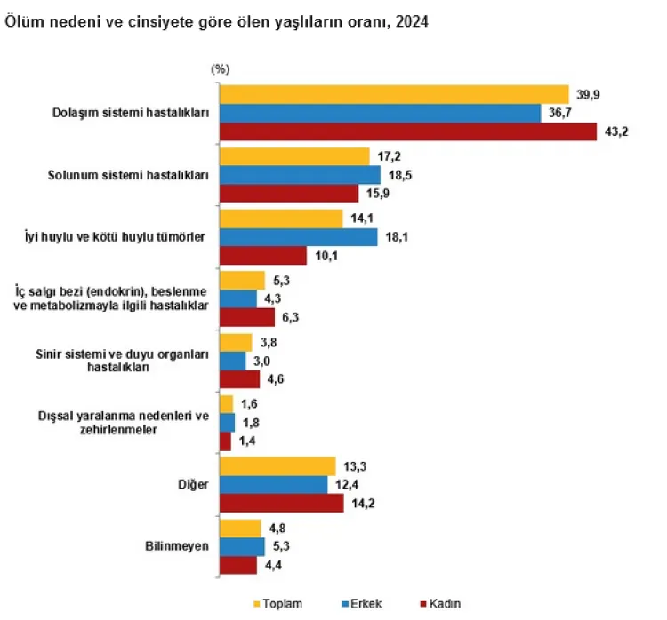 Ölüm nedenleri açısından veriler incelendiğinde yaşlıların yüzde 39,9’u dolaşım sistemi hastalıklarından hayatını kaybederken, yüzde 17,2’si solunum sistemi hastalıkları ve yüzde 14,1’i tümörler nedeniyle yaşamını yitirdiği gözlendi.