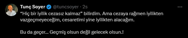 Tutuklama kararının ardından sosyal medya hesabından paylaşım yapan Tunç Soyer, “Hiçbir iyilik cezasız kalmaz bilirdim. Ama cezaya rağmen iyilikten vazgeçmeyeceğim, cesaretimi yine iyilikten alacağım. Bu da geçer… Geçmiş olsun değil, gelecek olsun!” ifadeleriyle tepkisini dile getirdi.