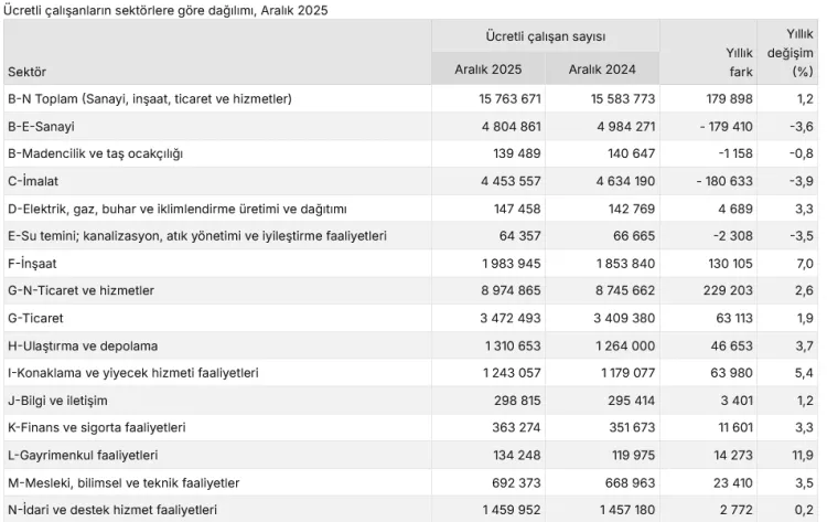 Buna göre; sanayi, inşaat ve ticaret-hizmet sektörleri toplamında ücretli çalışan sayısı, 2024 yılı Aralık ayında 15 milyon 583 bin 773 kişi iken, 2025 yılı Aralık ayında yüzde 1,2 artışla 15 milyon 763 bin 671 kişiye çıktı.