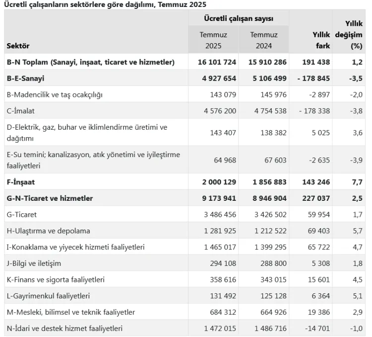 Temmuz ayına ilişkin ücretli çalışan sayısı verilerini açıklayan TÜİK'e göre sanayi, inşaat ve ticaret-hizmet sektörleri toplamında ücretli çalışan sayısı, bir önceki yılın aynı ayına göre yüzde 1,2 artarak 16 milyon 101 bin 724’e yükseldi. Ücretli Çalışan İstatistikleri aylık bazda ise yüzde 0,3 artış kaydetti.