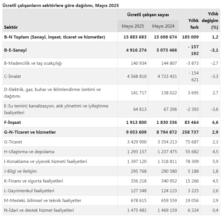 Verilere göre; sanayi, inşaat ve ticaret-hizmet sektörleri toplamında ücretli çalışan sayısı 2025 Mayıs’ta, geçen yılın aynı ayına kıyasla yüzde 1,2 artış gösterdi.