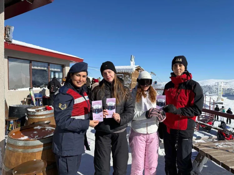 BURSA (İGFA) - Bursa İl Jandarma Komutanlığı’na bağlı Aile İçi Şiddetle Mücadele ve Çocuk Kısım Amirliği personeli tarafından, Uludağ Milli Parkı’na kış turizmi amacıyla gelen ziyaretçilere yönelik Kadın Acil Destek Uygulaması (KADES) hakkında bilgilendirme faaliyeti gerçekleştirildi.