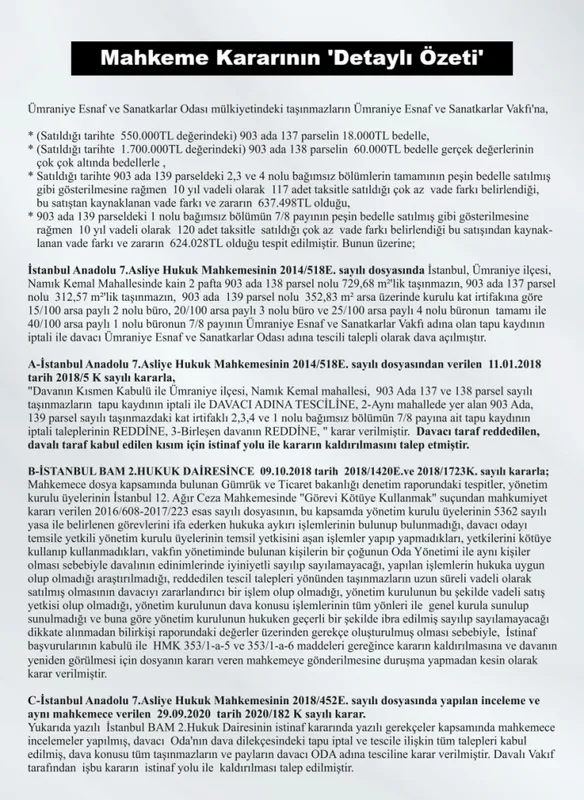 İstanbul'da Ümraniye Esnaf ve Sanatkârlar Odası’na ait taşınmazların önceki yönetim tarafından usulsüz şekilde bir vakfa devredilmesine ilişkin açılan tapu iptal ve tescil davası, tüm yargı aşamalarında oda lehine sonuçlandı. Yaklaşık 500 milyon TL değerindeki taşınmazlar yeniden esnafın oldu.