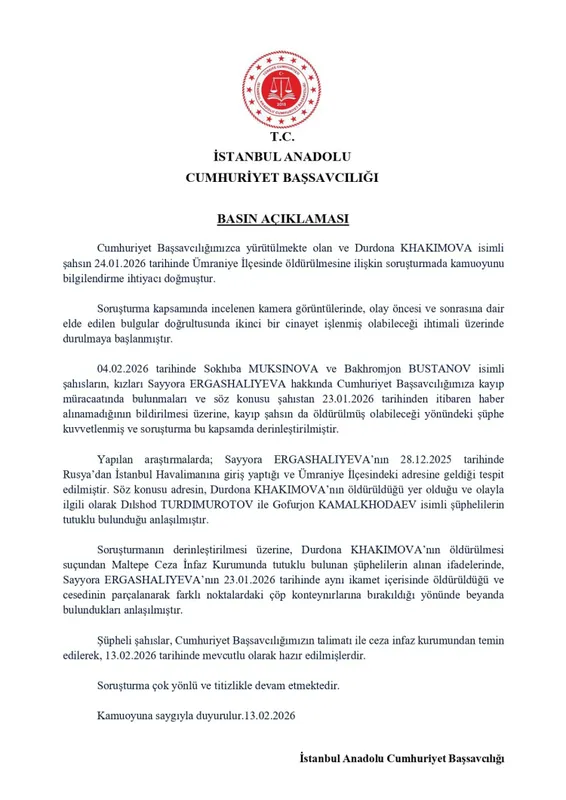 Başsavcılıktan yapılan yazılı açıklamada, 24 Ocak 2026 tarihinde Ümraniye’de Durdona Khakimova’nın öldürülmesine ilişkin yürütülen soruşturma kapsamında yeni bulgulara ulaşıldığı belirtildi. Kamera görüntülerinin incelenmesi sonucu, olay öncesi ve sonrasına dair elde edilen veriler doğrultusunda ikinci bir cinayet işlenmiş olabileceği ihtimali üzerinde durulmaya başlandığı kaydedildi.