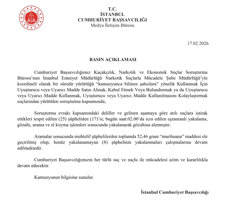 İstanbul’da yürütülen soruşturmada 25 şüpheliden 17’si yakalandı, 52 gramdan fazla marihuana ele geçirildi. Firari durumda bulunan 8 şüphelinin yakalanmasına yönelik çalışmalar sürüyor.