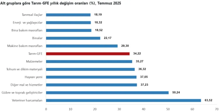 Türkiye İstatistik Kurumu (TÜİK), Temmuz 2025 Tarım Girdi Fiyat Endeksi'ni (Tarım-GFE) açıkladı. Endeks (2020=100), aylık yüzde 3,68, yıllık yüzde 34,22 artış gösterirken, veteriner harcamaları yıllık bazda yüzde 63,52 ile rekor kırdı.